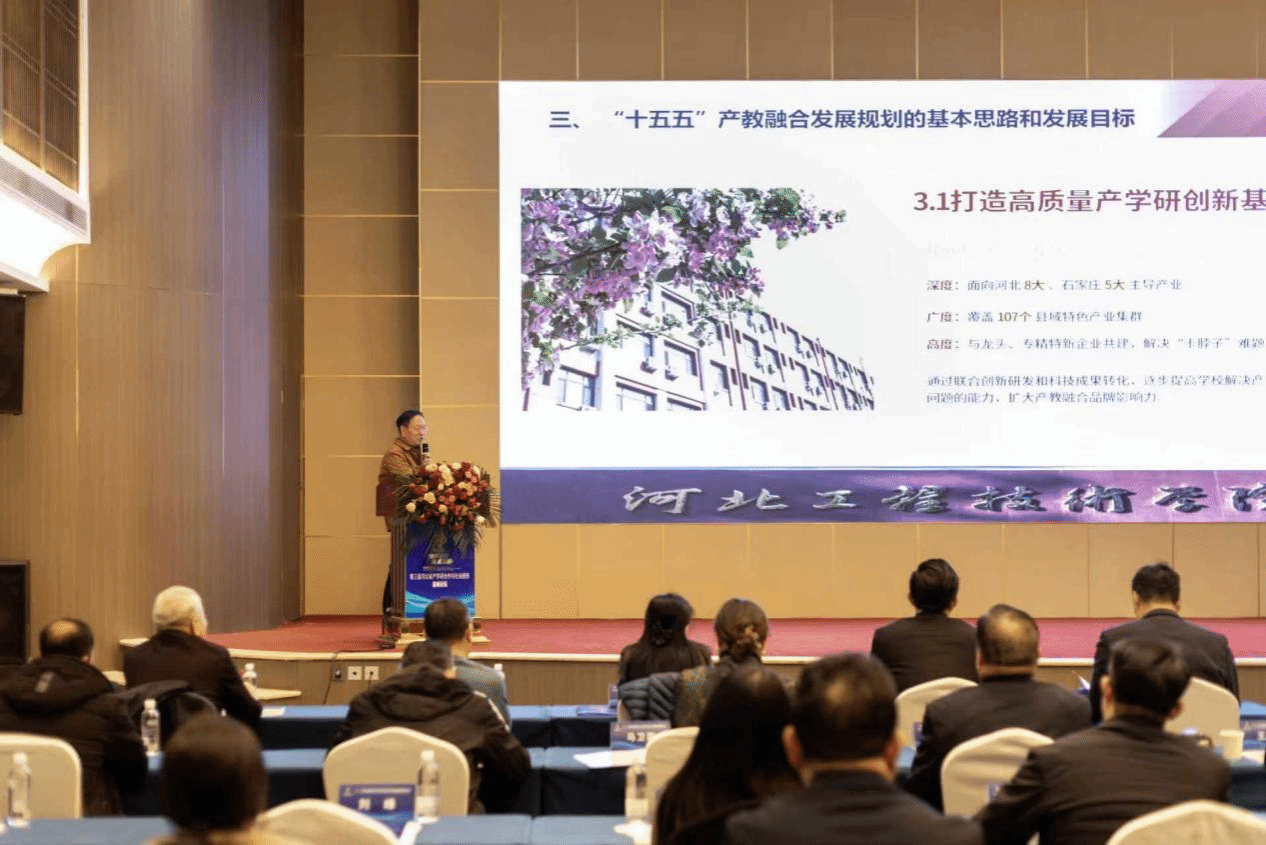 校长安黎哲致辞并宣布论坛开幕。他强调,推动产学研深度融合、实现协同育人,是国家创新驱动发展战略的关键,也是应用型高校的核心使命。他介绍了学校“立足河北、服务京津冀、辐射全国”的办学定位,以及建设高水平应用型大学、培养“兴业英才”的战略目标。他还表示,学校将深度融入河北省八大主导产业体系、石家庄五大千亿级产业集群及107个县域特色产业集群建设,整合校内资源,联合政企,筹建县域特色产业产教融合联合体,搭建开放性行业生态与协同创新平台,为河北省产业升级、高质量发展及新质生产力发展提供服务支撑。