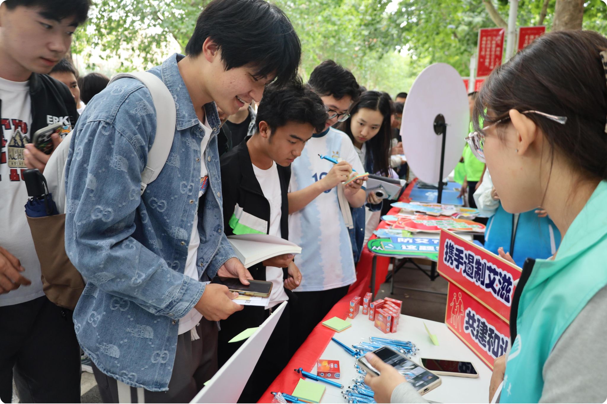 活动现场,工作人员向师生发放了安全套、HIV检测试剂盒等物品,倡导安全性行为,引导科学预防,从源头降低艾滋病传播风险。桥西区疾控中心、后勤处疾控与医保中心及校团委志愿服务指导中心还联合设置了互动环节,邀请学生在便利贴上写下防艾标语,并张贴于主题展板展示。此外,现场还发放了内容丰富的防艾宣传手册及实用小礼品,进一步扩大了宣传覆盖面。